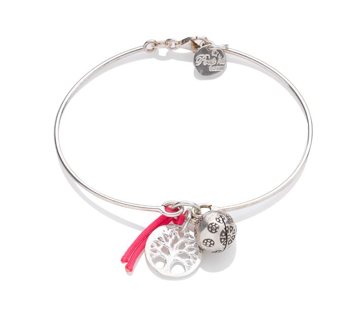 Composé d’un jonc en argent, ce bracelet est un véritable symbole. Accrochées à ce jonc, 3 breloques : un arbre de vie, un petit grelot et un petit lien en tissus.